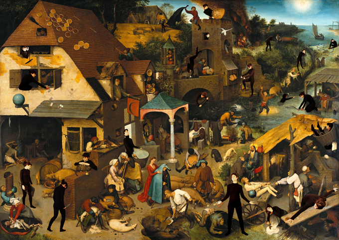 Nayla Dabaji, The world is turned upside down, 2015 : a remake of Pieter’s Bruegel “Netherlandish Proverbs”, 1559